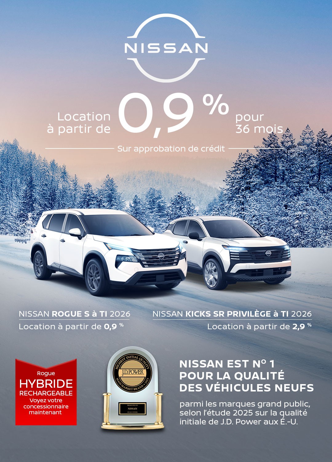 Si vous êtes à la recherche d’un VUS Nissan, vous aurez l’embarras du choix parmi nos différents modèles neufs et d’occasion. Du compact mais polyvalent Kicks neuf au populaire Nissan Rogue 2023, en passant par le spacieux Pathfinder 2024 et ses 3 rangées de sièges, la gamme de VUS que vous trouverez chez votre concessionnaire Nissan répondra aux besoins de chaque acheteur. De plus, ne manquez pas de jeter un œil à nos Rogue usagés et à nos Qashqai d’occasion!